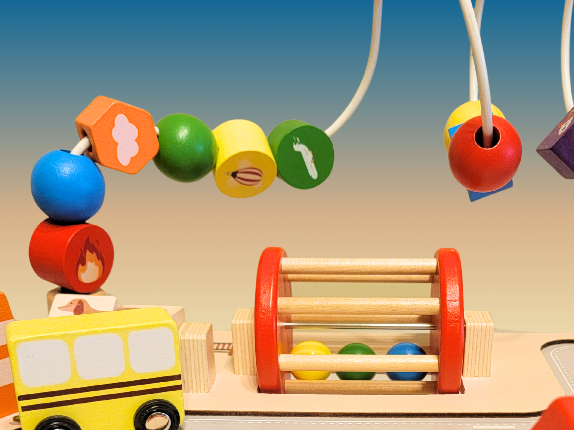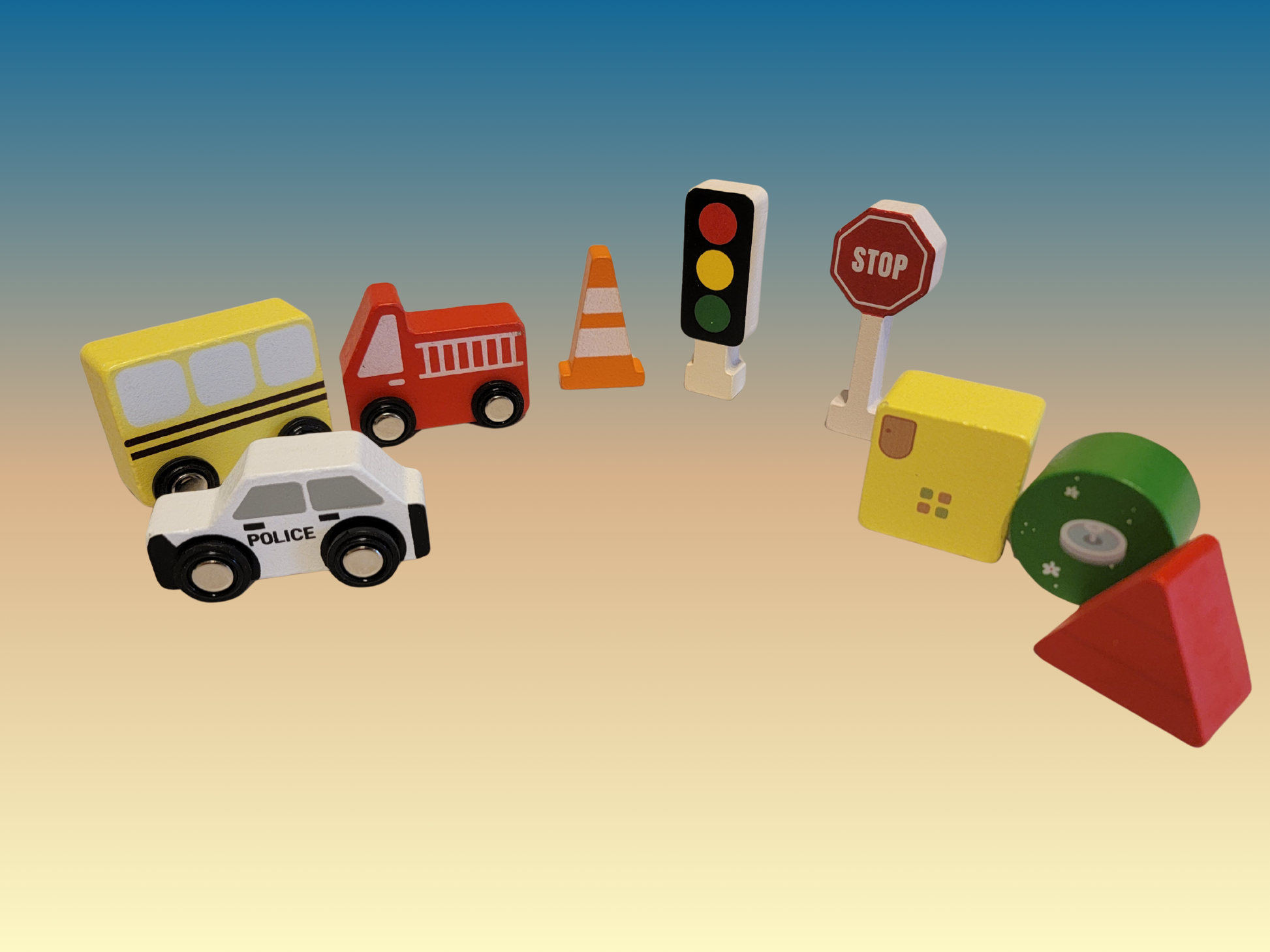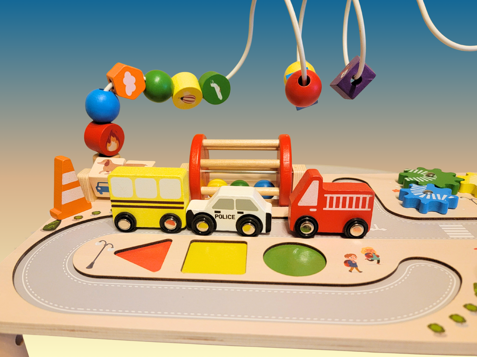 Traffic Cognition: Featuring wooden cars (bus, police, fire truck) and a traffic light for early learning.