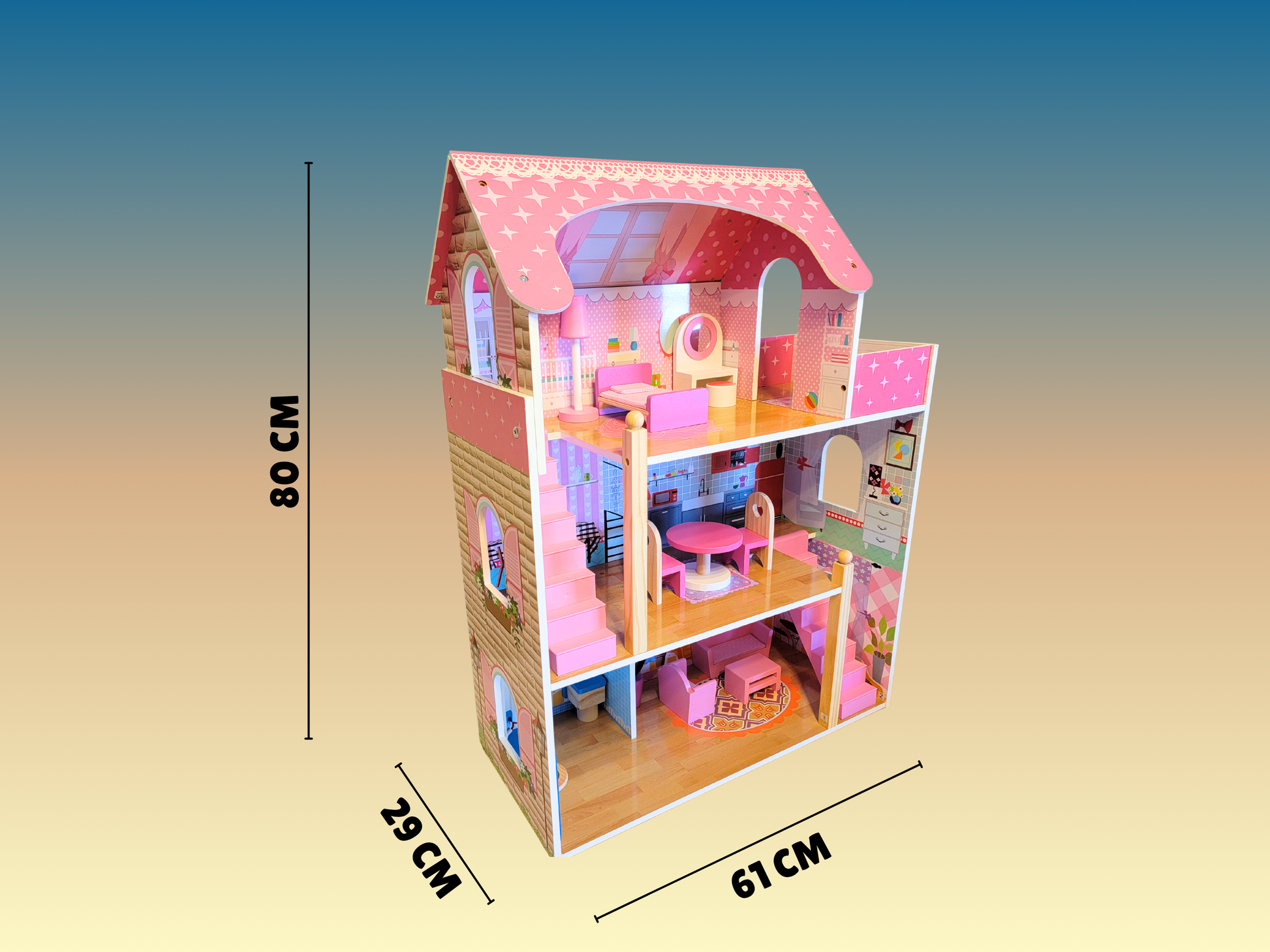 Standing tall at an impressive 80x61x29 cm, this beautiful pink wooden dollhouse is a dream come true for little ones. Designed for endless storytelling and interactive fun, this durable dollhouse features three spacious floors, multiple rooms, and charming pink-themed decor. It’s the ultimate educational and pretend play gift that will spark creativity for years to come.