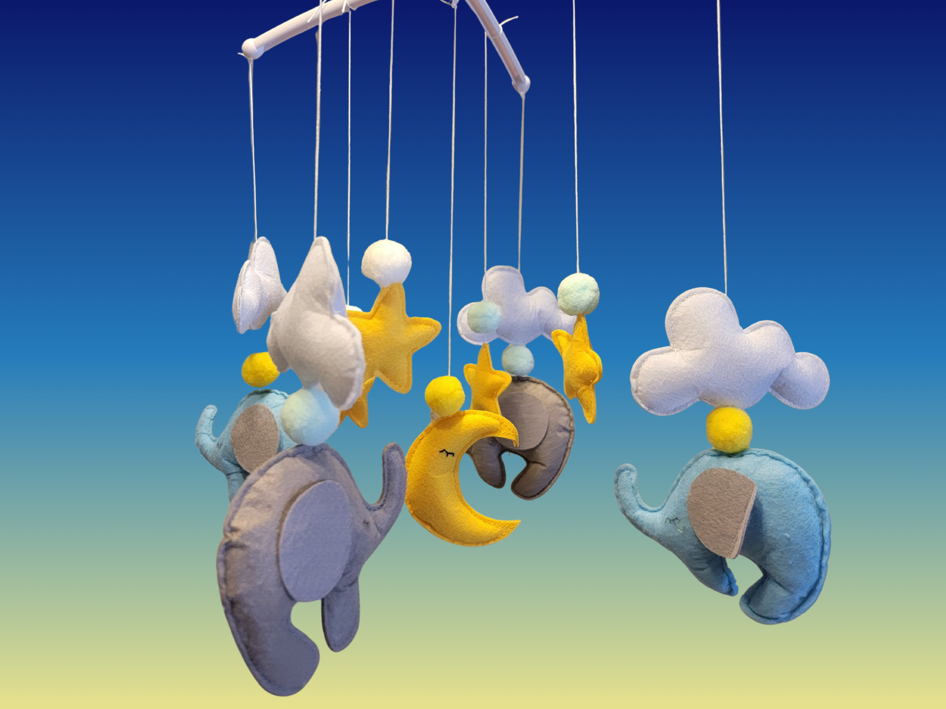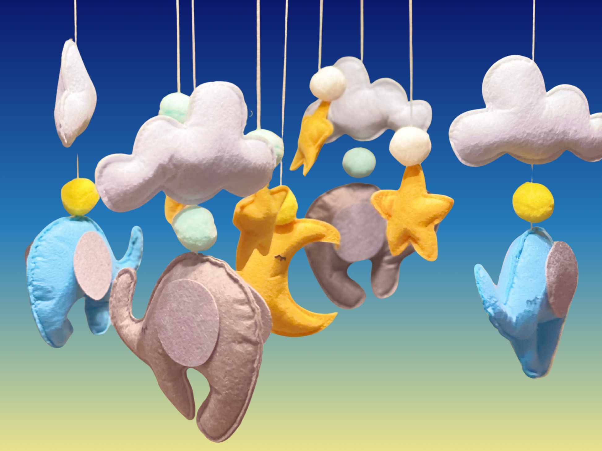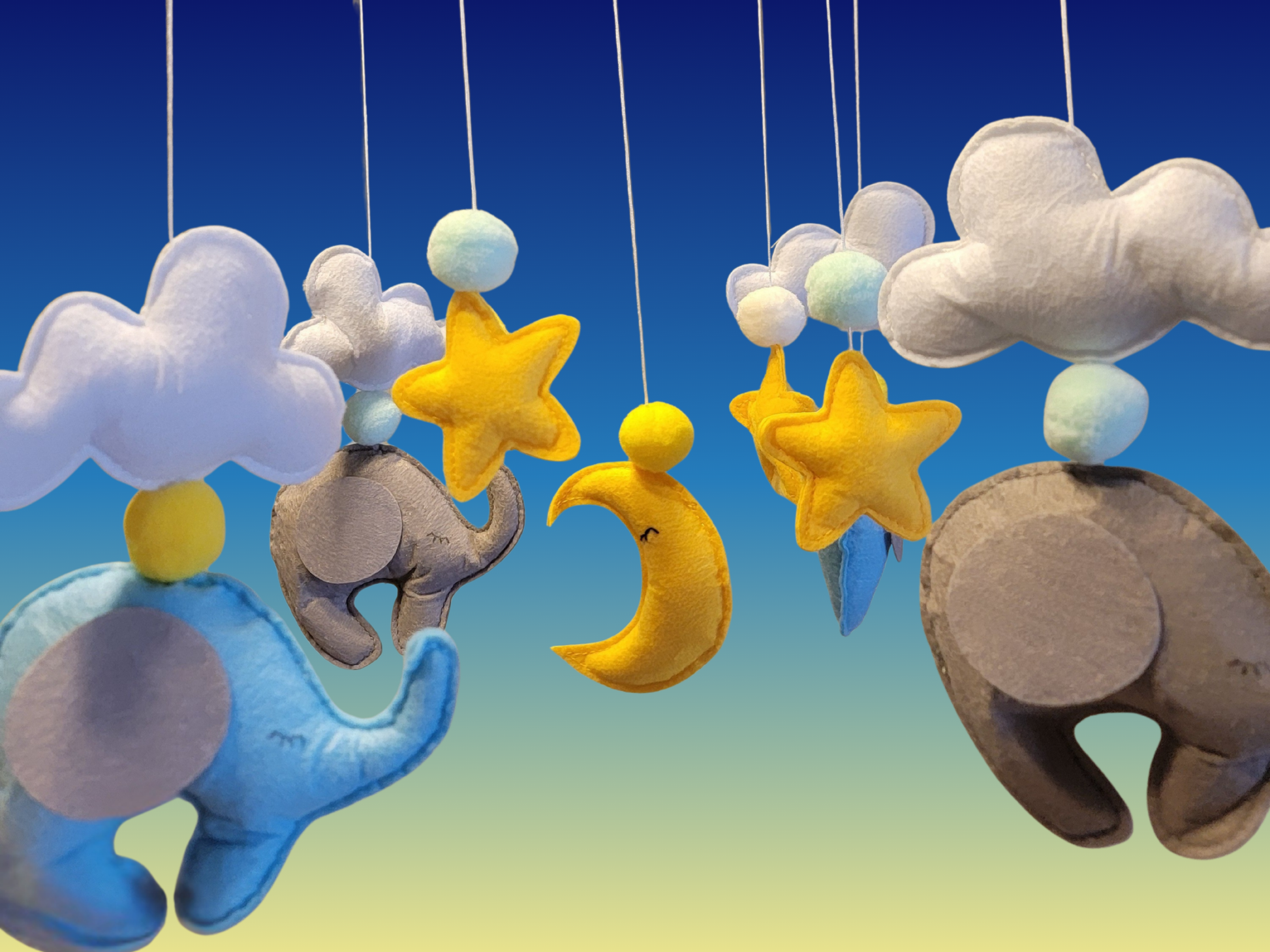 Charming Figures: Features a delightful mix of felt shapes: elephants, soft clouds, bright stars, and a sweet crescent moon.